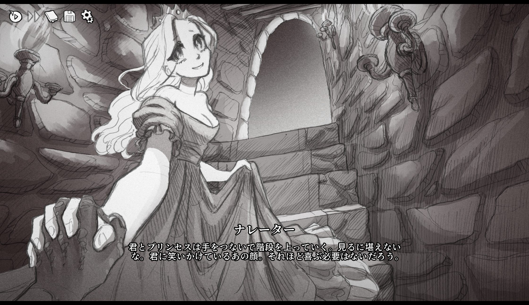 - 姫の手を取れば、ここから先は二人の問題だからと、勇者は一緒には来ない。ありがとうって言えば「こちらこそありがとう」と返ってくる。勇者はずっとナレーターの言葉に迷ったり疑ったりしながら、最後まで味方だった。